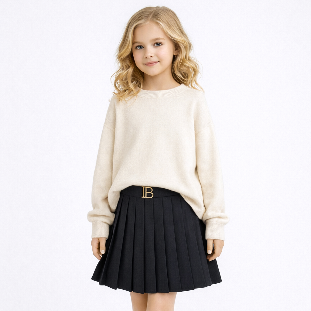 Deze antraciet plissé rok met gouden gesp is een stijlvolle en tijdloze keuze voor meisjes. De diepe plooien geven de rok een elegante uitstraling, terwijl de elastische tailleband zorgt voor extra draagcomfort.