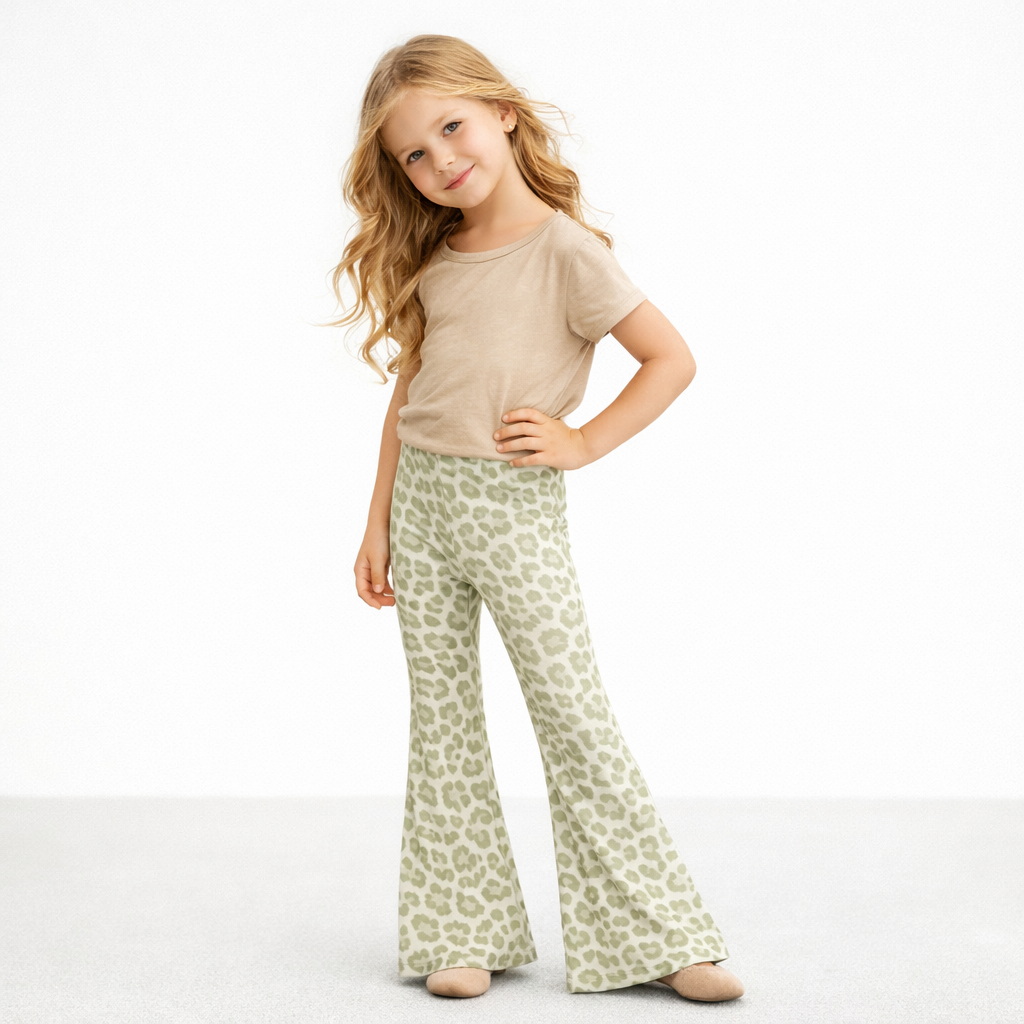 Deze lichtgroene panterprint flared broek voor meisjes is een zachte en trendy eyecatcher. De subtiele leopard print in een lichte groentint geeft de broek een frisse en stijlvolle uitstraling. Dankzij de flared pijpen en de comfortabele stretchstof zit deze broek heerlijk en beweegt hij soepel mee, ideaal voor actieve meiden.