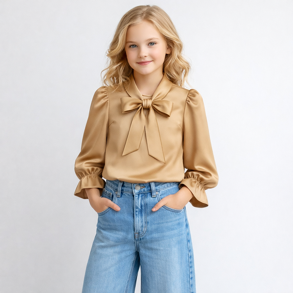 Champagne kleurige blouse met strik en pofmouwen voor meisjes